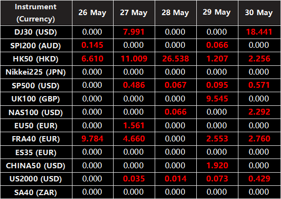 Please be advised that the dividends of the following index CFDs will be adjusted by upcoming ex-dividend dates. The comment for trading index CFDs will be in the following format “Div&<Product Name>&<Net Volume>” which show in the balance after the close of the day before the dividend payment date.
